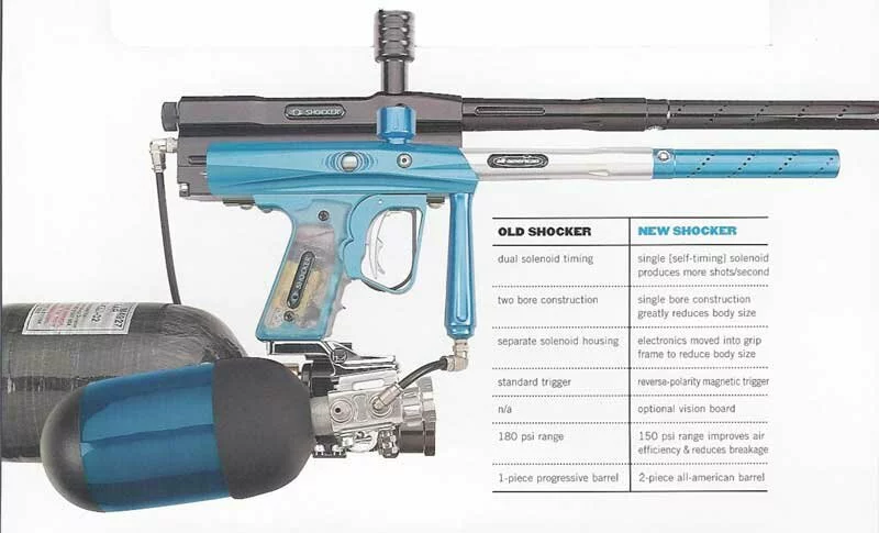 As you can see from the picture above, there's not a whole lot to the new Shocker 03. In our opinion, that's a good thing. Fewer things to break that way! A quick rundown on what everything does, how it works, and what we think of it: A single solenoid powers the OPEN bolt Shocker. The air fires from the bolt after the small holes in the bolt pass the end of the bolt shaft. Simple. The solenoid blows the bolt forward and back. The gun works on about 190psi. We may be able to knock that down a bit as we mess with the Shocker some. There are 4 parts to the internals. The bolt, bolt guide, fire chamber, and the bolt sleeve. Everything but the bolt (which is Delrin) is made of aluminum. They all slide out the back by turning the bolt shaft out with an allen wrench. They can be pretty hard to remove quickly however as the fit is very tight. The board is split into two halves. This is so everything can fit into the incredibly small Shocker. The top board attached to the solenoid houses the on/off switch, the blue LED light, the Vision connector, and the solenoid connection. The board is soldered directly to the solenoid. NO MORE BROKEN WIRES! The lower board in the grip frame houses the cricket speaker, the dwell/bps switches, the 9 volt battery connector, the micro switch, and all the other junk that make the Shocker work. The dwell can be adjusted up and down with the two small gray push buttons on the board. These same buttons, with the trigger depressed, turn the ROF up and down. The new Shocker 03 is supposed to fire 20 bps at it's highest setting. The trigger uses magnets in stead of springs for the return. We are NOT fans of magnetic triggers but we do have to say that Smart Parts did a great job of getting this one to feel just right. The trigger can be adjusted for pre and post travel and length to the switch. All from outside the gun! The trigger feel is very nice and walking it is a snap. You can also tune the magnetic return pressure if you feel like getting deep into your Shocker's guts. It's a bit more complicated than simply turning a screw somewhere as you have to take the lower board out of the frame. Ball detents come stock on the new Shocker 03 with one side being a short version, and the other a long. There's a slot on the side of the gun for the vision eye and it's wires to go. The vision system is completely internal with NO externally visible parts. Even the wire is routed up inside the body and out of sight. We believe the vision system will be a very important part of ANY Shocker. It fires so fast that you will cut balls in half. Even if you have a force feeder like a Halo or an Ego you may sometimes out shoot your loader and chop balls. The ball detents and the feed tube use the same thread as the Impulse so there are already some aftermarket accessories out there for this new Shocker. In the picture you see a New DeSIGNZ No rise Halo feed tube installed. The barrel threads are the same as the old Shocker Sports. My impressions after playing with it for two tournaments and several practices? It's the best gun I've ever shot. Period. But it's not perfect. While the new Shocker 03 is very easy to take apart because there are so few parts, those parts can be hard to get out of the gun. In order to get the guts out, you must remove the bolt guide and use that to push the bolt and the blot sleeve out. To remove the fire chamber only a long strong finger is required, but it can be a pain in the butt trying to hook the back of it with your finger tip, and pull it out. When removing the grip frame (though you really shouldn't) be VERY careful of the on/off switch and the super thin wire harness that hooks everything up. It's extremely easy to pinch the wires in half, break the button part of the switch or just generally misalign things. We've broken both the switch and the harness already! If you tinker with this gun too much, you WILL break something. The Shocker 03 weighs next to nothing which is fantastic, but at a price. The price is the side walls of the body are very thin and could get crushed if you're not careful. How does it shoot? Holy Shiznit Batman. Straight, smooth, flat, fast. It's damn near perfect. But again, at a cost. The Shocker sucks air like a 50 year old smoker hanging a flag in the last 5 seconds of a game. In our informal tests we got about 600 shots from a 68/4500. When we get some more solid numbers we will post them here. We are planning on doing some more tinkering with things like the dwell, FPS and secrety kinds of stuff. One last complaint that may get me in trouble, but oh well, of the three pre-production Shockers we got in, only ONE worked without a hitch. The other two we had to "fix" some things that didn't work straight from Smart Parts. If you know Smart Parts, you know that's nothing new. After having said all that I want to re-emphasize my original opinion, the new Shocker is the best marker I've ever shot. It has the accuracey, the speed, and weight, to make it THE gun to shoot. John Young |